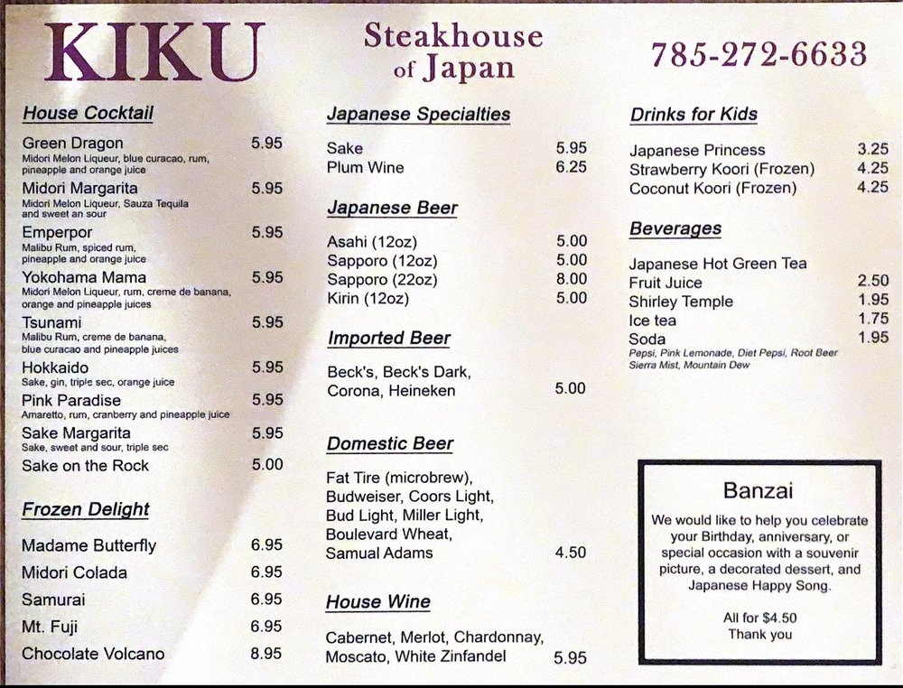 Kiku Japanese Steak House Menu